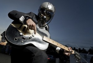 Clad in his cannonball man, extra tight jumpsuit and signature motorcycle helmet with telephone/microphone attached, Bob Log 111 unfailingly sweats up a river while kicking on a kick drum, stomping his homemade foot cymbal and playing slide on an old archtop guitar.
